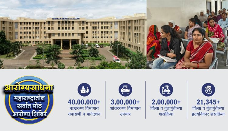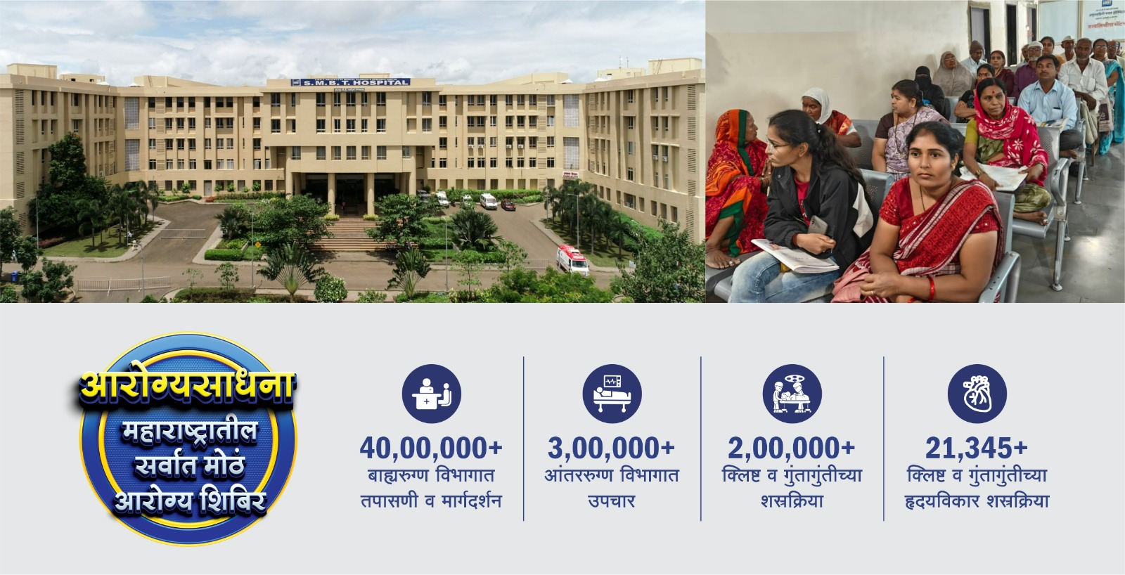 हॉस्पिटलच्या वतीने १ जुलै ते ३०  सप्टेंबर आरोग्यसाधना शिबिराचा ३ महिन्यांत तब्बल १ लाख ५४ हजार २८९ रुग्णांनी लाभ घेतला. यामध्ये ८ हजार ७९९ रुग्णांवर आंतररुग्ण विभागात उपचार करण्यात आले. तर ३ हजार ६५७ रुग्णांवर क्लिष्ट आणि गुंतागुंतीच्या शस्रक्रिया झाल्या. विशेष म्हणजे, हृदयविकार विभागात १ हजार १२७ हृदयविकार शस्रक्रिया, १४५ बायपास (Open Heart Surgery) शस्रक्रिया झाल्या आहेत.  एसएमबीटी हॉस्पिटलमधील तज्ज्ञ डॉक्टर २४ तास उपलब्ध होते. येथील तज्ज्ञ डॉक्टरांकडून तपासणी करून घेण्यासाठी नागपूर, भंडारा, अमरावती, गोंदिया, जालना, छ. संभाजीनगर जिल्ह्यातील मोठ्या संख्येने रुग्ण दाखल झाले आहे. समृद्धी महामार्गासाठी ठरवून दिलेल्या वेगाचा खऱ्या अर्थाने विदर्भ आणि मराठवाड्यातील रुग्णांना फायदा झाला आहे.