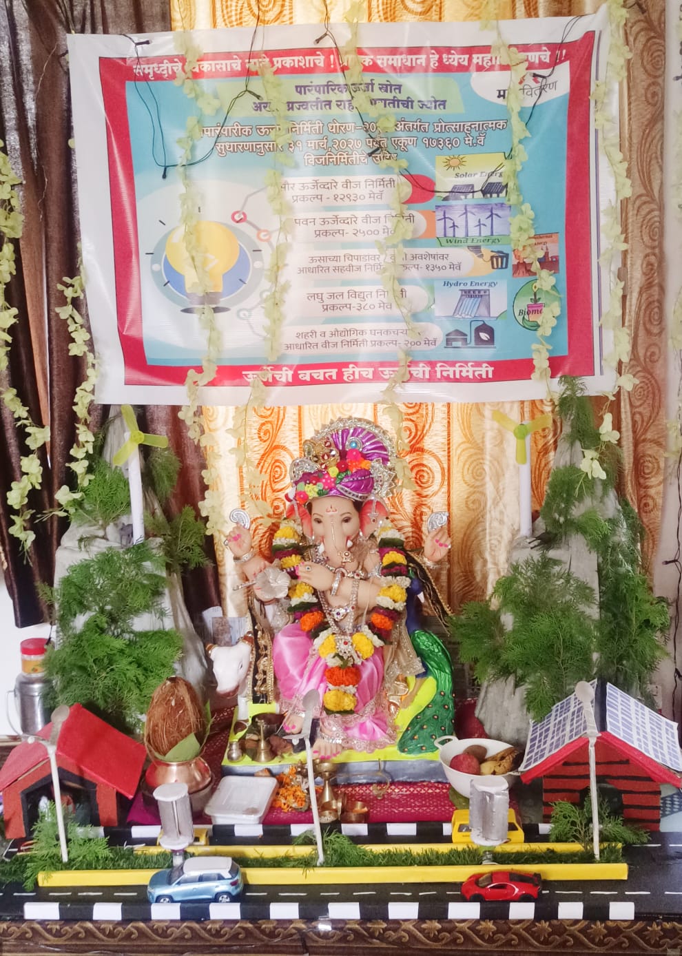 गणरायांसमोर तयार केलेले या देखाव्याच्या माध्यमातून प्रत्यक्ष अपारंपरिक ऊर्जा कशा पद्धतीने तयार होते, सोलर पॅनल व पवनचक्की द्वारे उर्जा निर्मिती. तसेच बायो ऊर्जा, भू औष्णिक ऊर्जा या माध्यमातून करण्यात येणारी ऊर्जा निर्मिती या माध्यमातून दाखविण्यात आलेली आहे.