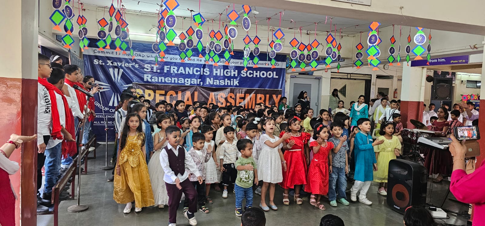 या निमित्ताने विशेष सभेचे आयोजन करण्यात आले होते. कार्यक्रमाची सुरुवात मुख्याध्यापिका सौ. मंजू पाटील यांच्या नेतृत्वाखाली प्रभू प्रार्थनेने झाली. त्यानंतर सौ. शीतल चिंचोळीकर यांनी बायबल वाचन केले. इयत्ता पाचवीच्या विद्यार्थ्यांनी सुमधुर प्रार्थना गीत सादर केले, तर प्री-प्रायमरी विभागातील विद्यार्थ्यांनी वाढदिवसाचे गीत गाऊन कार्यक्रमात आनंदाची भर घातली.