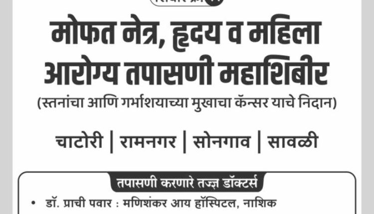 मणिशंकर आय हॉस्पिटल, नाशिकच्या संचालिका व प्रसिद्ध नेत्ररोग तज्ज्ञ डॉ. प्राची पवार, श्री साई बाबा हार्ट इन्स्टिट्यूट, नाशिकचे संचालक व प्रसिद्ध हृदयरोग तज्ज्ञ डॉ.अनिरुद्ध धर्माधिकारी आणि नामको, हाॅस्पीटल,नाशिक येथील नामवंत डाॅक्टरांच्या उपस्थितीत आरोग्य तपासणी पार पडणार आहे.
