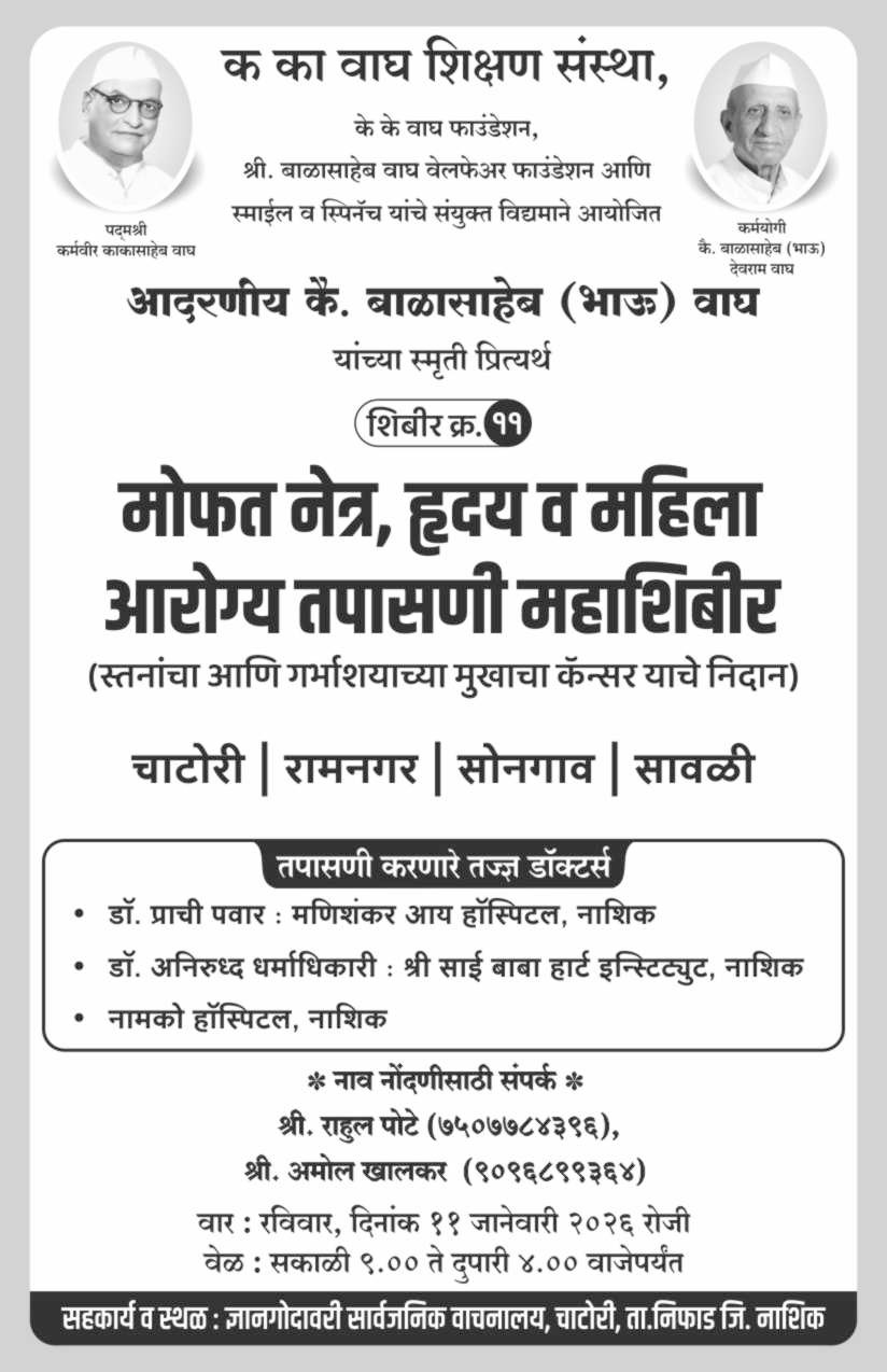 के के वाघ शिक्षण संस्था, नाशिक, के के वाघ फाऊंडेशन, श्री. बाळासाहेब वाघ वेल्फेअर फाऊंडेशन, स्माईल व स्पिनॅच यांचे संयुक्त विद्यमाने आदरणीय कै. बाळासाहेब (भाऊ) देवराम वाघ यांच्या स्मृती प्रित्यर्थ रविवार ( दि. ११ ) सकाळी ९ ते दुपारी ४ वाजेदरम्यान ज्ञानगोदावरी सार्वजनिक वाचनालय, चाटोरी ता.निफाड येथे मोफत आरोग्य तपासणी शिबीराचे आयोजन करण्यात आले आहे.