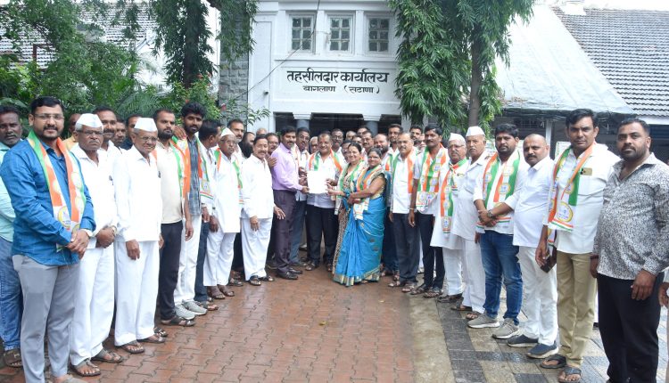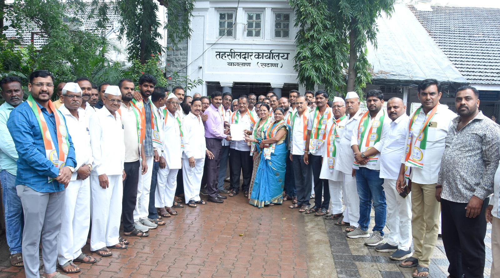 आज सकाळी अकरा वाजता बागलाणचे माजी आमदार संजय चव्हाण आणि पक्षाचे तालुकाध्यक्ष केशव मांडवडे यांच्या नेतृत्वाखाली आज तहसीलदार कैलास चावडे यांना घेराव घालून राष्ट्रवादी काँग्रेस शरदचंद्र पवार पक्षातर्फे आंदोलन छेडण्यात आले. यावेळी ‘ओला दुष्काळ जाहीर झालाच पाहिजे, बळीराजाला न्याय मिळालाच पाहिजे, अशी जोरदार घोषणाबाजी करून शासनाविरोधात तीव्र संताप व्यक्त करण्यात आला. यावेळी बोलताना तालुकाध्यक्ष केशव मांडवडे म्हणाले, मंत्र्यांच्या तालुक्यांना तत्काळ दुष्काळी जाहीर केले जाते, मात्र लगतच्या इतर तालुक्यांना मदतीपासून वंचित ठेवले जाते. हा अन्याय आहे. जोपर्यंत शेतकऱ्यांच्या हक्काची मदत मिळत नाही, तोपर्यंत आम्ही शांत बसणार नाही. शेतकरी उद्ध्वस्त झाला आहे, त्याचे भविष्य पाण्यात गेले आहे. सरकारने तातडीने मदत केली नाही तर परिस्थिती अधिकच गंभीर होईल. यावेळी दिलेल्या निवेदनात, संपूर्ण महाराष्ट्रात तात्काळ ओला दुष्काळ जाहीर करावा. शेतकऱ्यांना तातडीने कमीत कमी हेक्टरी २५ हजार रुपये मदत द्यावी. सर्व शेतकऱ्यांची सरसकट कर्जमाफी करावी. जनावरांच्या मृत्यूबाबत भरघोस नुकसानभरपाई द्यावी. कांदा उत्पादक शेतकऱ्यांना भरीव आर्थिक मदत द्यावी. नैसर्गिक आपत्तीमध्ये मृत्यू पावलेल्या व्यक्तींच्या कुटुंबियांना प्रत्येकी किमान १० लाख रुपये मदत द्यावी. दोन वर्ष विकासकामे थांबवून निधी शेतकरी व ग्रामस्थांच्या मदतीसाठी उपलब्ध करून द्यावा. पीकविमा कंपन्यांना तातडीने पंचनामे करण्याचे आदेश द्यावेत. शेतकरी, शेतमजूर व बारा बलुतेदार वर्गासाठी विशेष पुनर्वसन पॅकेज द्यावे. आदि मागण्या करण्यात आल्या आहेत.