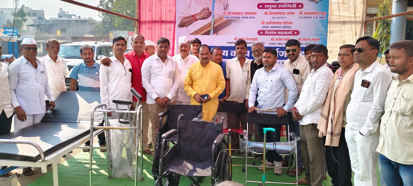 येथील दिव्यांग संघटनेने गावातील दिव्यांग तसेच गरजू रुग्णांसाठी अत्याधुनिक हॉस्पिटल बेड १, व्हीलचेअर 2, वॉकर 5, फोर स्ट्रोक थ्री स्ट्रोक सिंगल स्ट्रोक वॉकिंग स्टिक 5, रक्तदाब बीपी मोजण्याचे मशीन 1, वाफ देण्याचे मशीन 1, अपघाती बाथरूम खुर्ची 2, गरम पाण्याच्या बॅक 2, कुबड्या 2 इत्यादी वस्तूंचे लोकार्पण प्रमुख पाहुण्यांच्या हस्ते करण्यात आले. यावेळी दिव्यांग संघटनेचे वैभव वेलजाळी, किरण संधान, केशव ताजने, संजू गायकवाड, संकेत काटे, संतोष बीरे, ऋषिकेश पाचपाटील,विलास निकम, सतीश वेलजाळी , संपत जाधव,विशेष परिश्रम घेतले यावेळी या कार्यक्रमाचे सूत्रसंचालन विघ्नहर्ता प्रतिष्ठानचे संस्थापक गणेश वेलजाळी यांनी केले तर आभार पत्रकार संतोष भोपी यांनी व्यक्त केले.