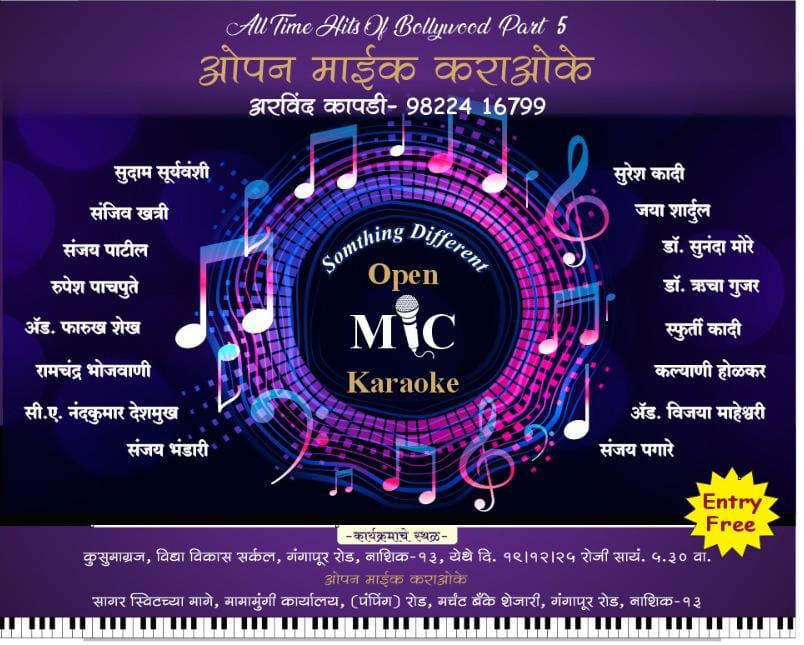 ही मैफल शुक्रवारी सायंकाळी ५.३० वाजता गंगापूर रोडवरील कुसुमाग्रज स्मारक येथील विशाखा सभागृहात आयोजित करण्यात आली आहे. ऍडव्होकेट माहेश्वरी यांच्यासोबतच सुरेश कादी, ज्या शार्दुल, डॉ. सुनंदा मोरे, डॉ. ऋचा गुजर, स्फूर्ती कादी, कल्याणी होळकर, संजय पगारे, सुदाम सूर्यवंशी, संजीव खत्री, संजय पाटील. रुपेश पाचपुते, ऍडव्होकेट फारूक शेख, रामचंद्र भोजवानी, सी ए नंकुमार देशमुख, संजय भंडारी हेदेखील गीत सदर करणार आहेत. याप्रसंगी रसिक श्रोत्यांनी उपस्थित राहावे, असे आवाहन आयोजकांच्या वतीने करण्यात आले आहे.