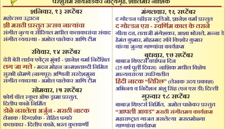 कार्यक्रम दररोज सायंकाळी 6.15वाजता परशुराम सायखेडकर नाट्यगृह येथे सादर होणार असून या विनामूल्य कार्यक्रमाचा आस्वाद सर्व रसिकप्रेमींनी घेऊन बाबा थिएटर्सने केलेल्या अविरत 25 वर्षाच्या कलेच्या आसक्तीला मानवंदना देतील. तपशिलासाठी प्रशांत जुन्नरे 9850609062 , ज्ञानेश वर्मा 960709699 या क्रमांकावर संपर्क साधावा