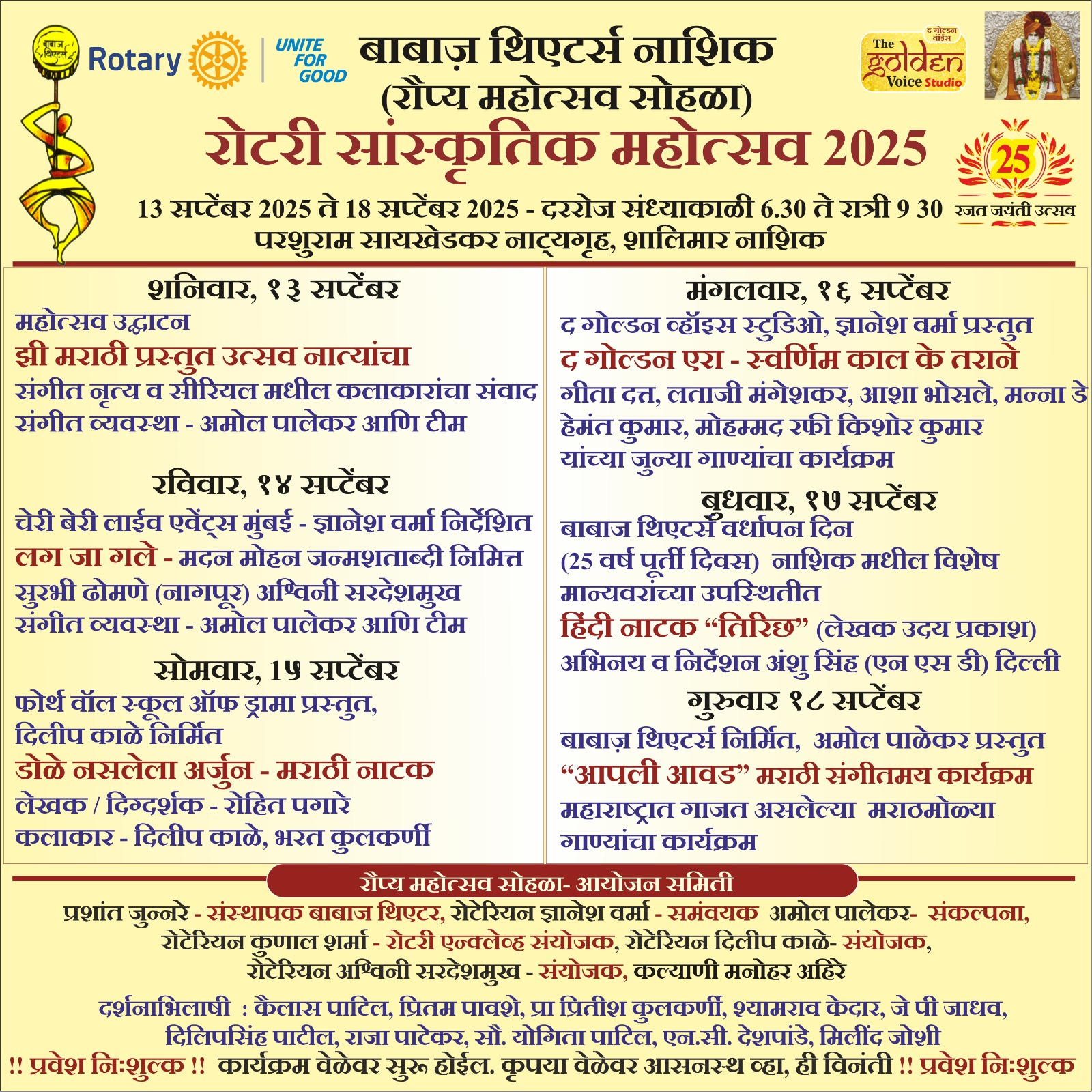 रोटरी क्लब ही एक आंतरराष्ट्रीय सामाजिक सेवा संस्था जी सामाजिक सेवेद्वारे जगभरातील लाखो लोकांच्या जीवनात सेवा करीत आहे. रोटरी क्लब बाबाज थिएटर्स सोबत एकत्र आले आहेत आणि या अतिशय उत्साहात हा रौप्य महोत्सव साजरा करीत आहे. यानिमित्ताने 13 ते 18 सप्टेंबर 2025 कालावधीत पाच दिवसांचा भव्य सांस्कृतिक महोत्सव “रोटरी कल्चरल फेस्टिवल 2025” चे आयोजन करण्यात आलेले आहे. या सोहळ्याचे उद्घाटन सामानाचे अध्यक्ष प्रा. दिलीप फडके, उपाध्यक्ष वैद्य विक्रांत जाधव, प्रमुख सचिव सुरेश गायधनी, कार्याध्यक्ष संजय करंजकर, संचालक प्रेरणावेळी तसेच रोटरीन ज्ञानेश्वर शेवाळे (3030 प्रांतपाल), दत्तात्रय देशमुख रमेश मेहेरे व आशा वेणूगोपाळ( माजी प्रांतपाल) यांच्या प्रमुख उपस्थितीत संपन्न होणार आहे.